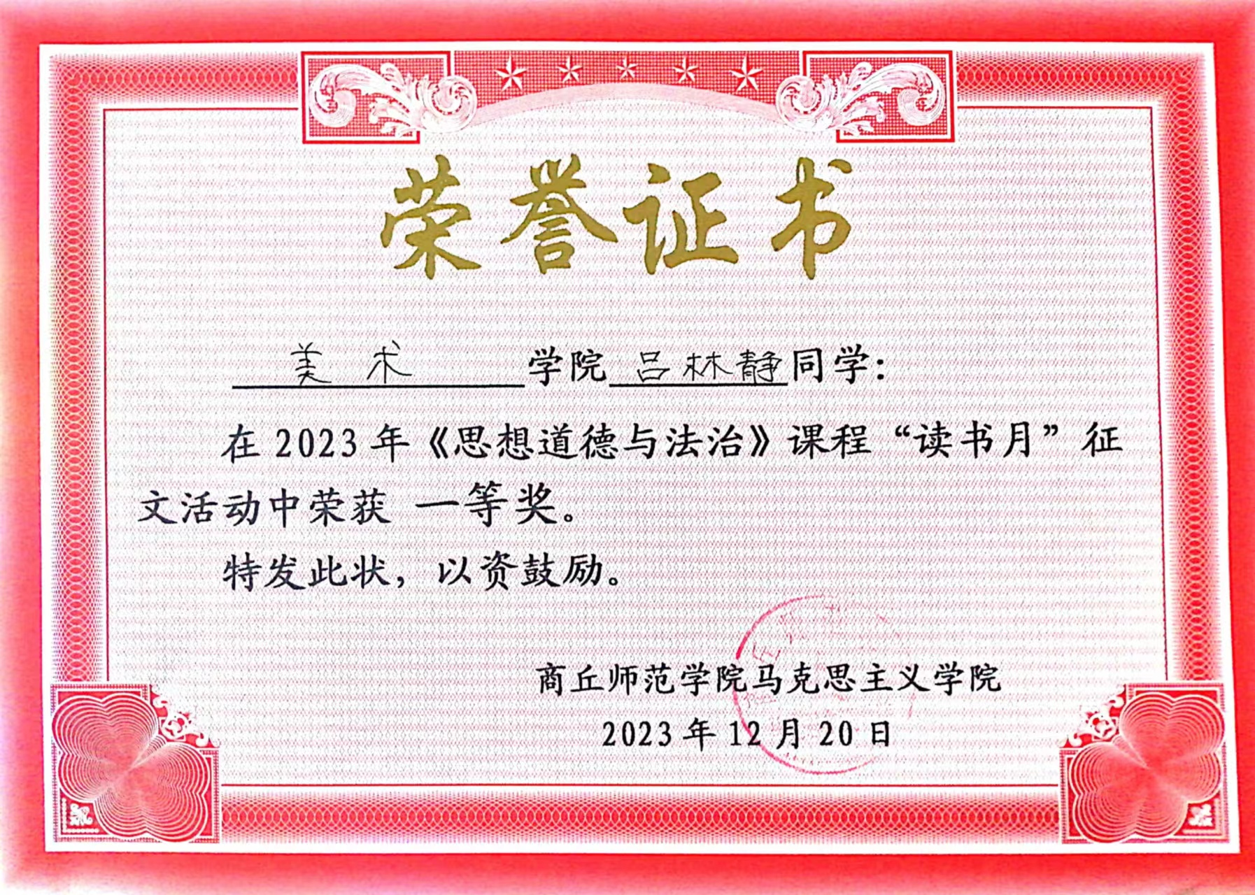 征文结束后,任课教师通过认真审阅每一位学生作品,评出一等奖112名、二等奖448名,并对获奖者予以了表扬奖励。