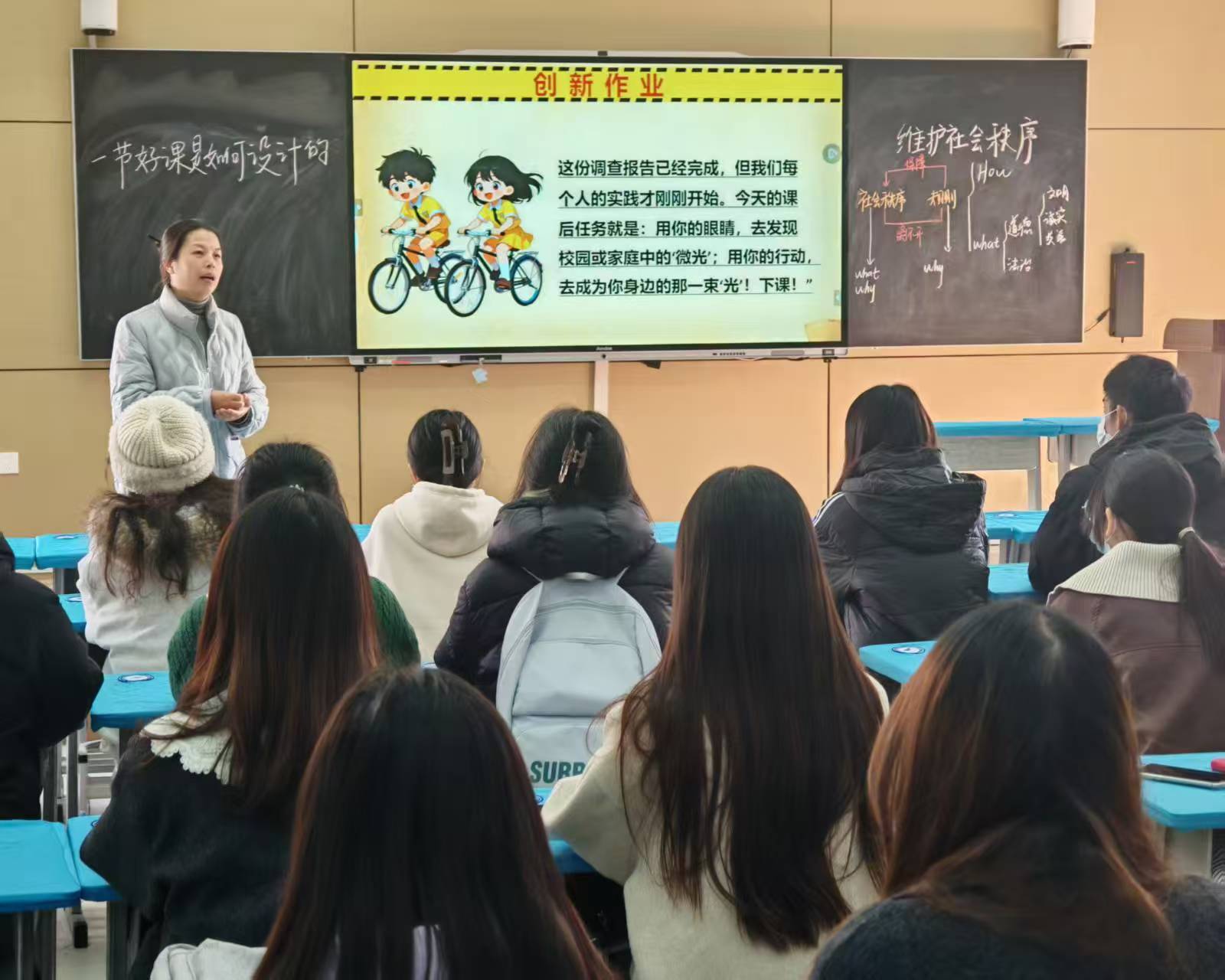 坊员们首先观摩了教学一线名师秦铭博老师以“维持社会秩序”为主题的道法课堂教学,亲身感受中学课堂的教学氛围与组织方式。坊员认真记录教学环节,观察师生互动细节,对教学设计、课堂管理与学生引导等有了更加的直观认知和深入了解。