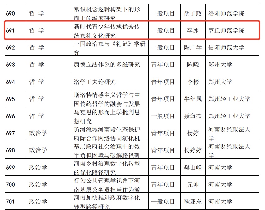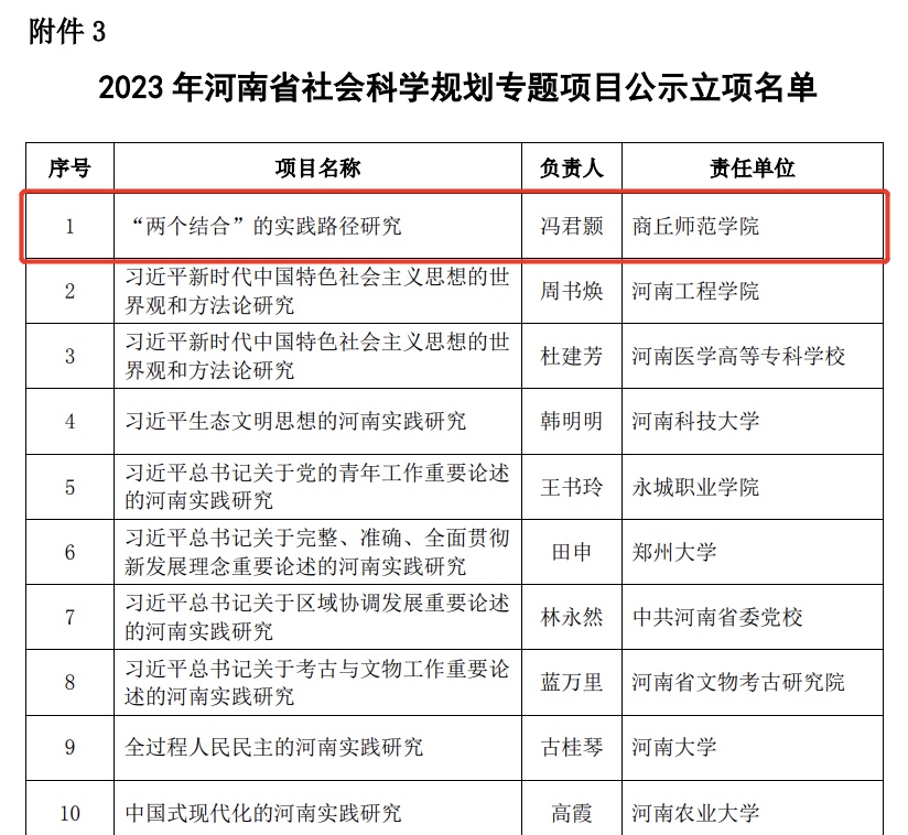 近日,河南省哲学社会科学规划办公布了2023年河南省哲学社会科学规划年度项目、决策咨询项目、专题项目立项名单,威廉希尔官网数据两位教师获批立项,分别是冯君颢博士的《“两个结合”的实践路径研究》和李冰博士的《新时代青少年传承优秀传统家礼文化研究》。