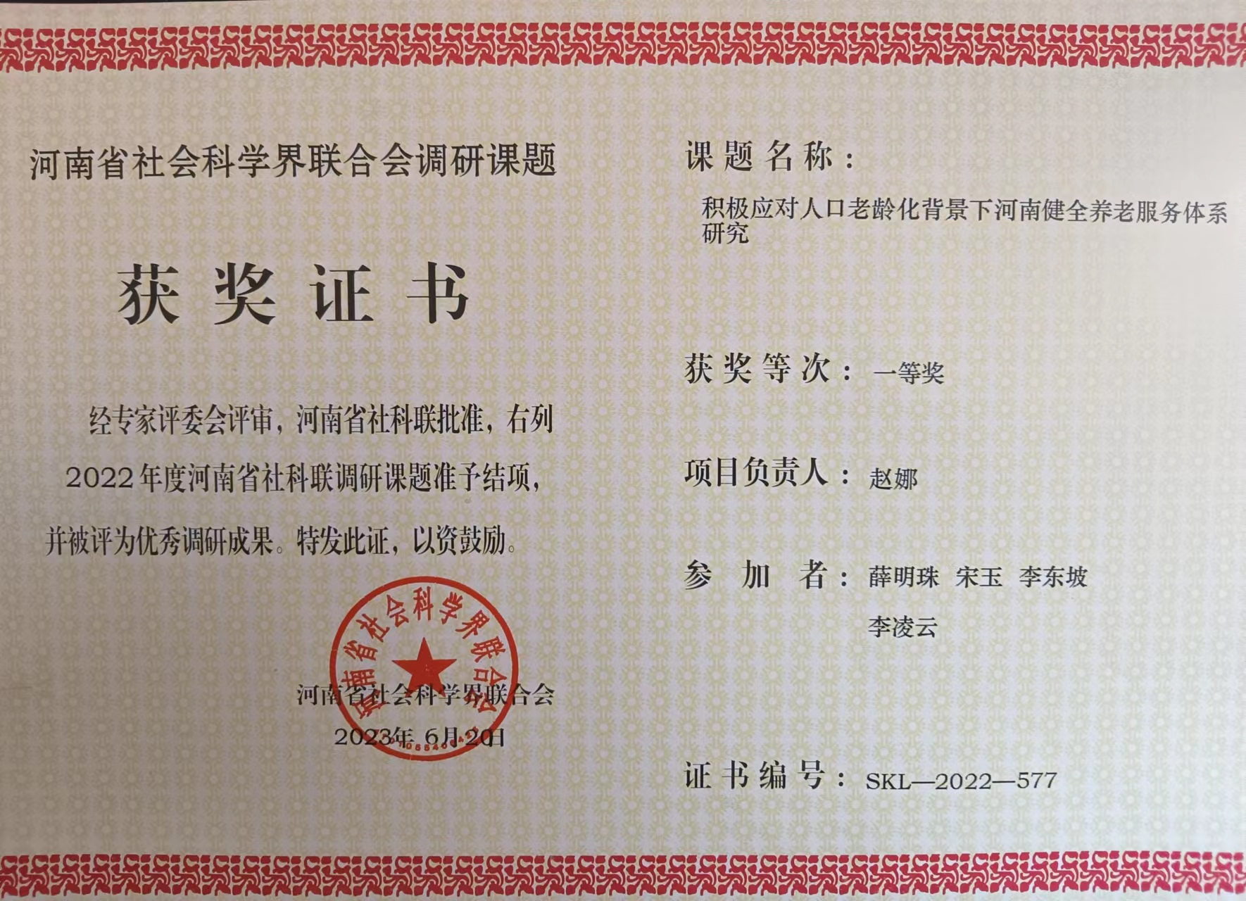 近日,威廉希尔官网数据赵娜博士主持的2022年度河南省社科联调研课题“积极应对人口老龄化背景下河南健全养老服务体系研究”经过河南省社科联批准,予以结项,被评为优秀调研成果一等奖。