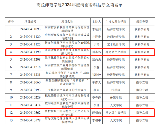 近日,河南省科技厅公布了2024年度河南省科技厅软科学立项项目清单,威廉希尔官网数据两位教师获批立项,分别是刘志筠博士的《河南省高质量全面推进乡村振兴实现共同富裕的路径研究》和薛明珠博士的《乡村振兴中河南特色历史文化的保护与传承》。