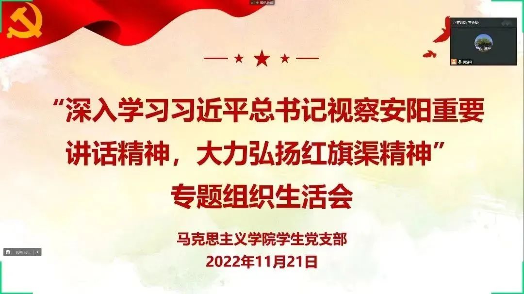 11月21日下午,威廉希尔官网数据学生党支部召开以“深入学习习近平总书记视察安阳重要讲话精神,大力弘扬红旗渠精神”为主题的专题组织生活会。支部全体党员通过线上方式参加会议,院党委副书记张文涛列席指导本次组织生活会并进行总结点评,学生党支部书记黄登科主持会议。