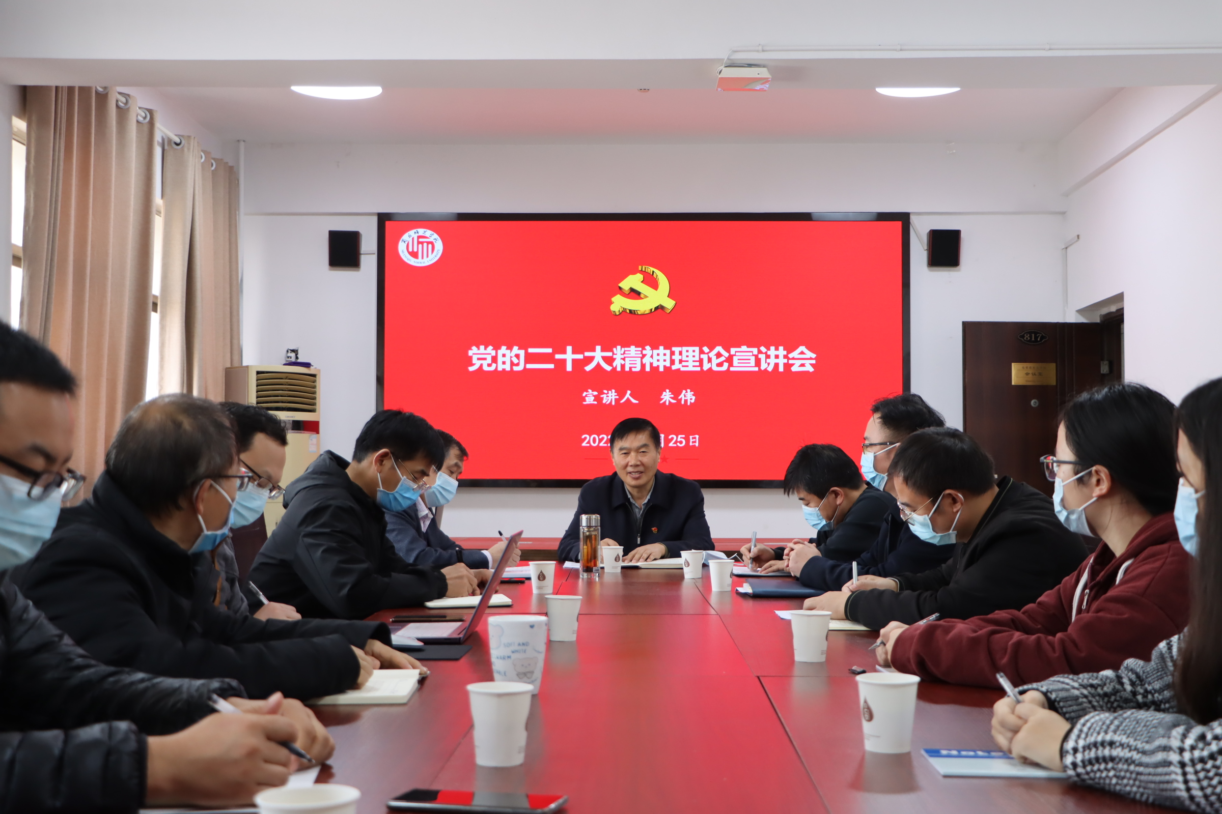 11月25日,校党委副书记、工会主席朱伟在梁园校区应天楼817会议室为威廉希尔官网数据师生宣讲党的二十大精神。威廉希尔官网数据领导班子成员、驻校值守教师和学生代表参加了宣讲报告会。