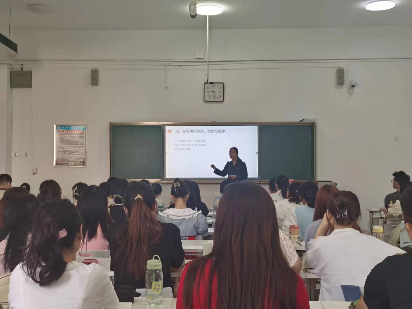 王晓征教授生动地讲解了“领导决策的类型与程序”这一主题,她结合现实生活案例重点讲解了战略决策、经验决策和常规性决策等类型,以及提出问题、确定目标、收集信息、拟定方案、分析评估、择优选择、方案实施和实施评估等环节。在课堂上,王晓征教授把本节课的知识点由学生分角色进行了过程模拟,突出了学以致用的特点。