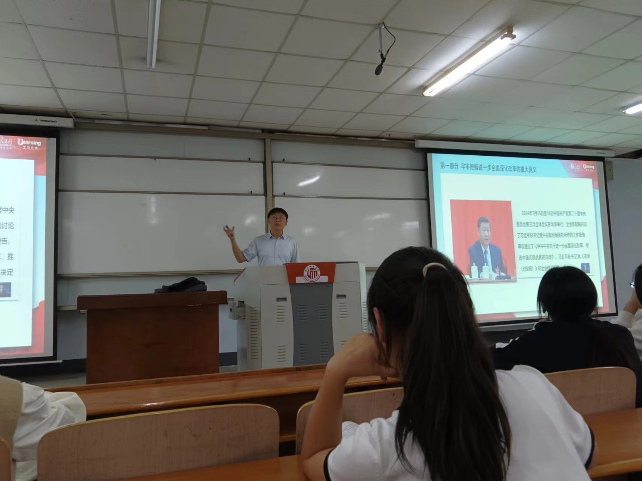 张灯老师结合《思想道德与法治》中“我国处在中国特色社会主义新时代”的相关内容,重点讲述了党的二十届三中全会通过的《中共中央关于进一步全面深化改革 推进中国式现代化的决定》(以下简称《决定》)第一部分进一步全面深化改革、推进中国式现代化的重大意义和总体要求。让学生明白“进一步全面深化改革的重要性和必要性”,认清“当前和今后一个时期是以中国式现代化全面推进强国建设、民族复兴伟业的关键时期”,引导学生深刻认识中国特色社会主义进入了新时代这个历史方位及取得的伟大成就。