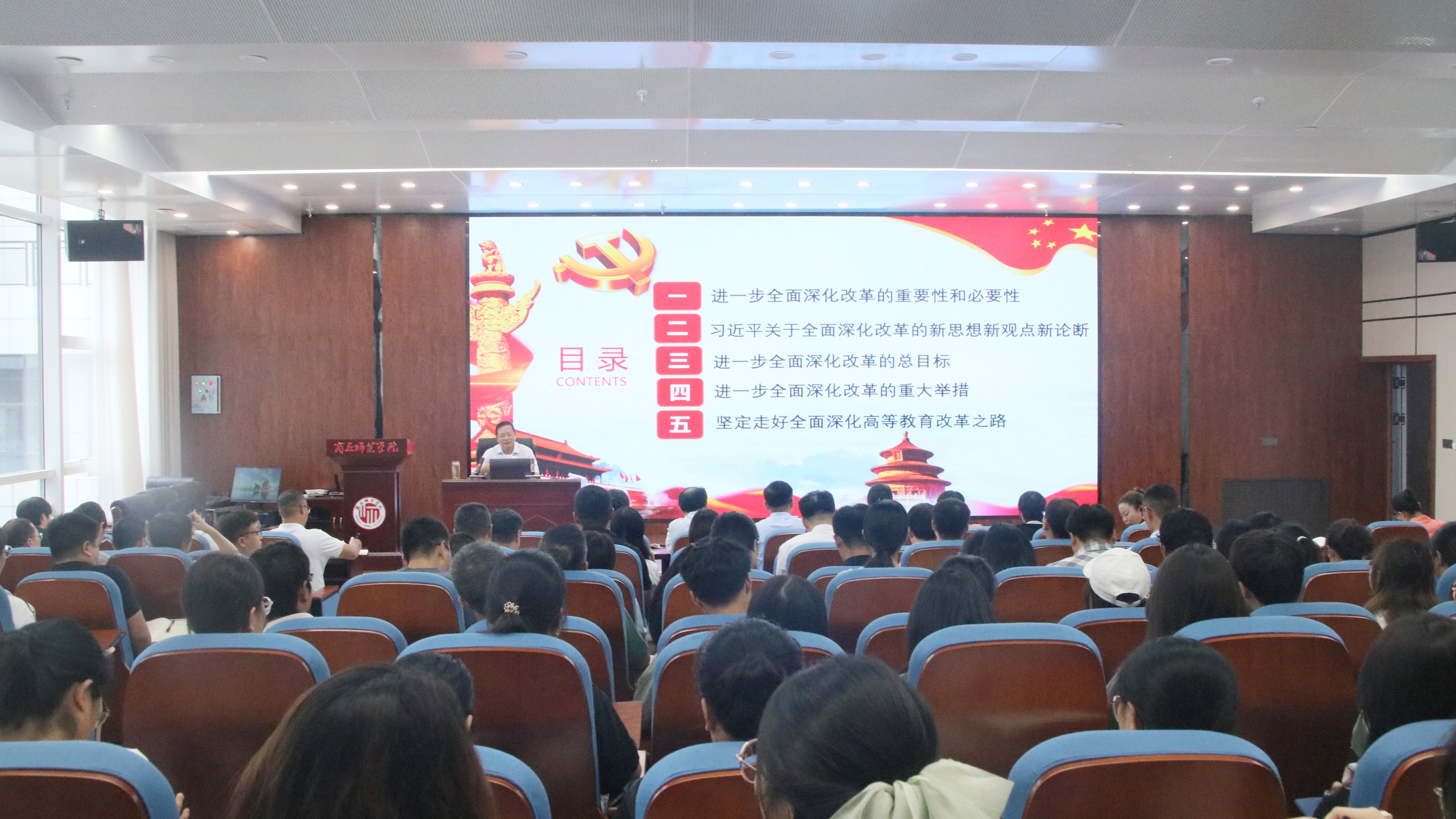 9月6日,副校长程功鹏以《深刻学习领会党的二十届三中全会精神,坚定当好进一步全面深化改革的践行者》为题为化学化工学院、生物与食品学院的学生代表讲授思政课。程功鹏围绕进一步全面深化改革的重要性和必要性、习近平总书记关于全面深化改革的一系列新思想、新观点、新论断、进一步全面深化改革的总目标和重大举措、坚定走好全面深化高等教育改革之路五个方面,深刻阐释了党的二十届三中全会的精神要义和实践要求。他勉励青年学子要着力提升科学素养与人文底蕴,注重培养创造力,树立正确的价值观、厚植爱国情怀、坚定理想信念。