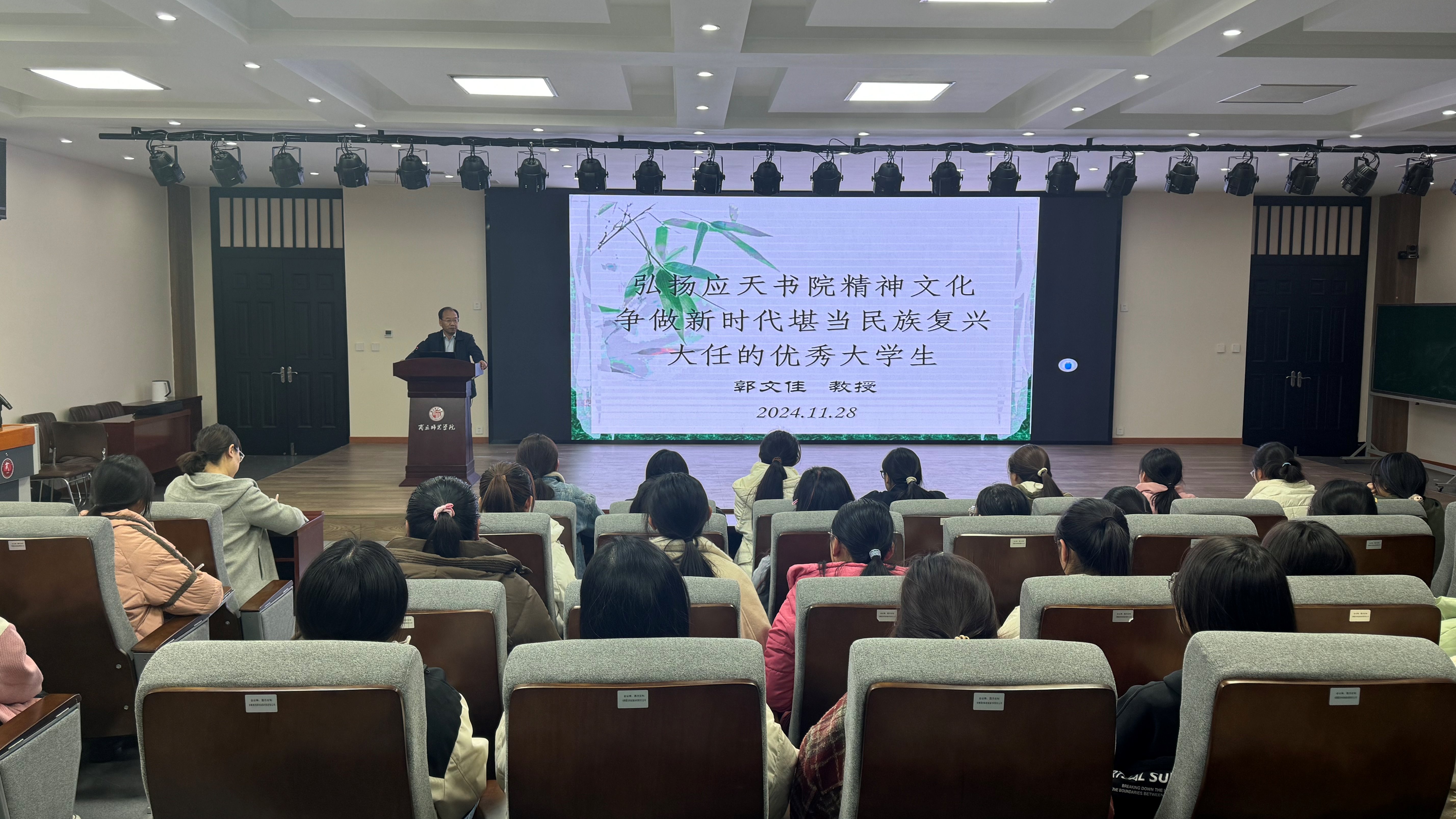 11月28日,副校长郭文佳以《弘扬应天书院精神文化,争做新时代堪当民族复兴大任的优秀大学生》为题为教师教育学院24级小学教育专业学生讲授思政课。郭文佳详细讲解了应天书院的历史渊源,明确了以范仲淹为代表的刻苦学习、积极进取,兼济天下、以苍生为念,先忧后乐以及兴学重教的应天书院精神文化。郭文佳强调,应天书院精神文化是我们宝贵的精神财富,需要我们在新时代不断传承与弘扬。希望同学们牢记使命,以应天书院精神为动力,在学术上勤奋钻研,在社会实践中勇于担当,努力成长为“有理想、有抱负、有本领、有担当”,能够堪当民族复兴大任的优秀大学生。