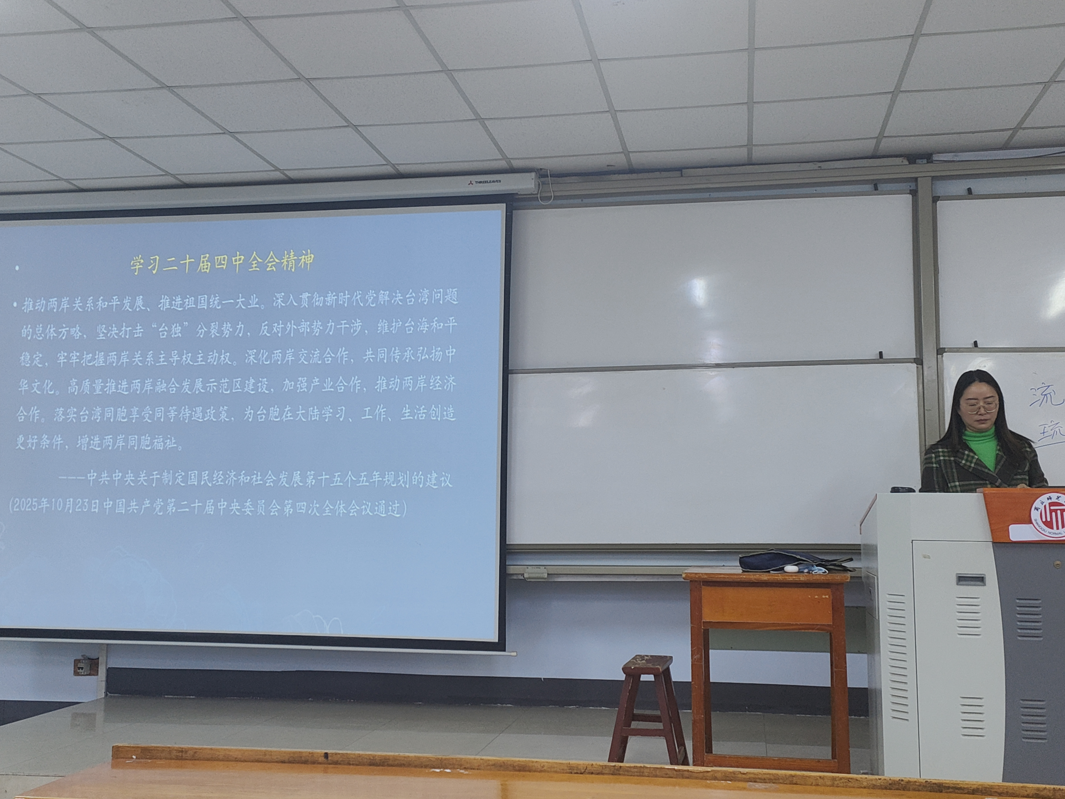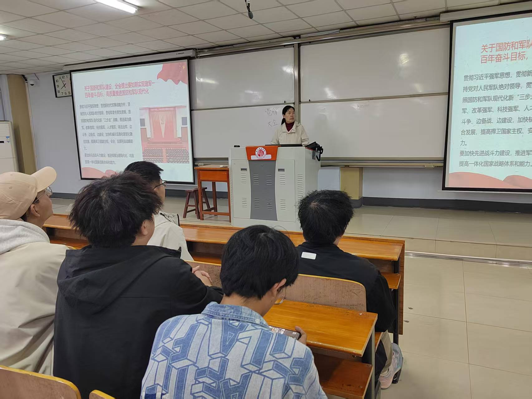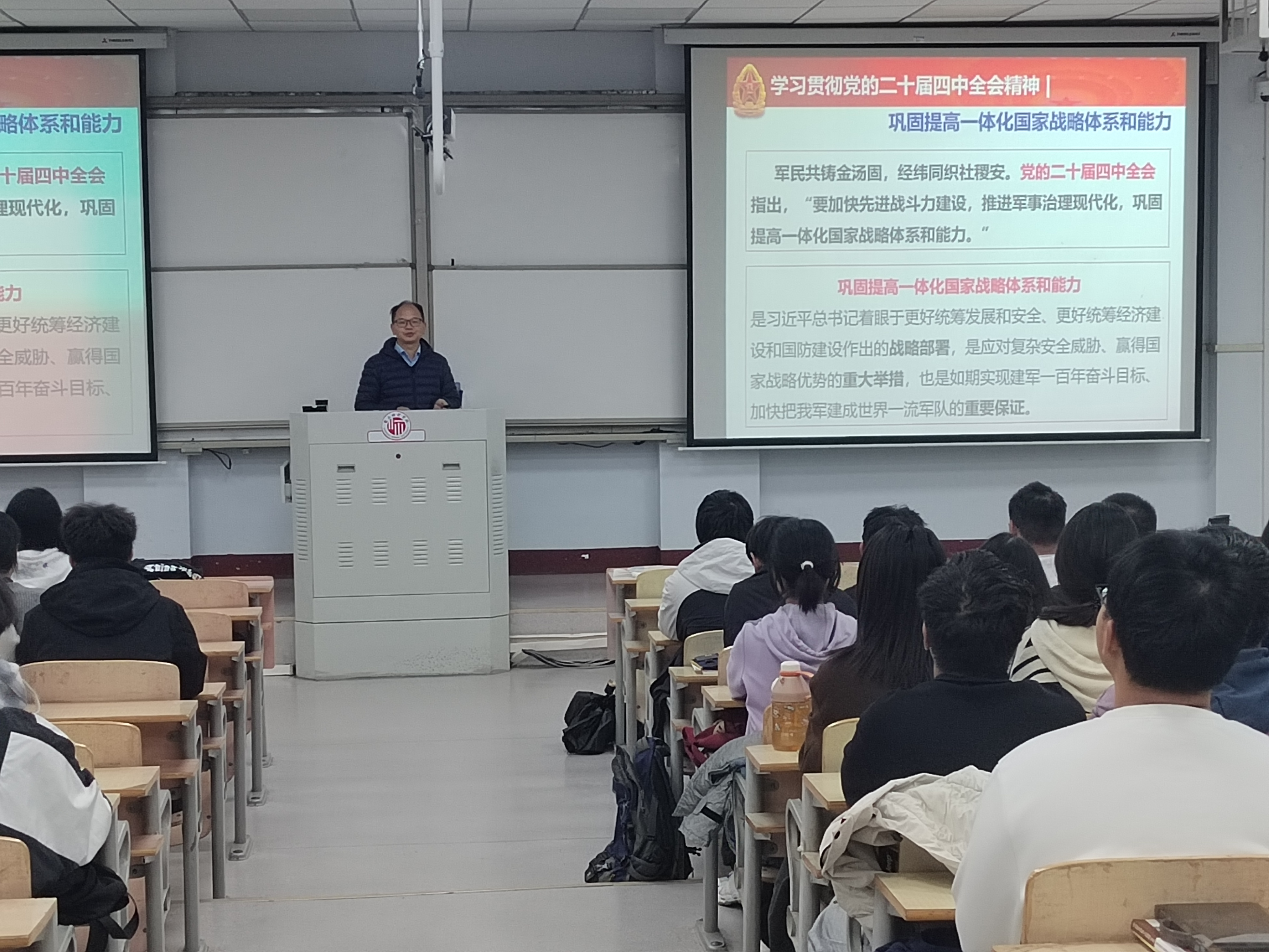 申月霞老师结合全会提出“推进国家安全体系和能力现代化”,向同学们分析了当前我国在“不断开创以中国式现代化全面推进强国建设、民族复兴伟业新局面”的关键时期所面对的国际形势,要牢牢把握党在新时代的强军目标,增强维护国家安全能力,以更加昂扬的斗志、更加过硬的本领,坚决捍卫国家安全和社会稳定,建设一支党和人民完全可靠的人民军队。