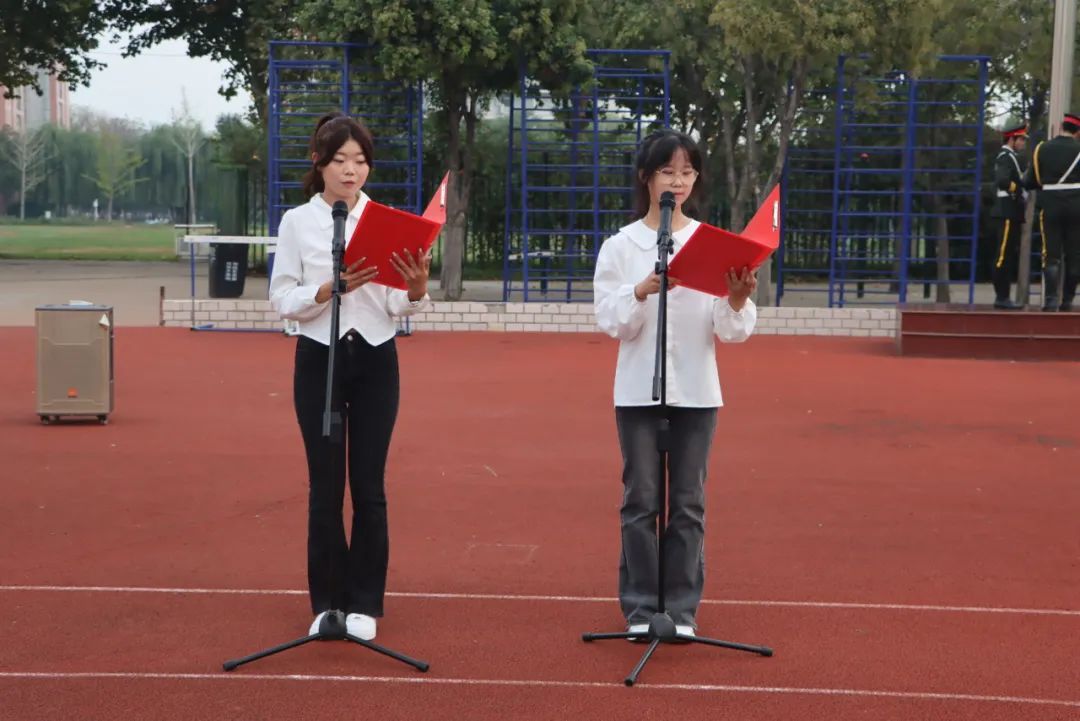 在飘扬的国旗下,2023级学生代表冯坤和杨梦真朗诵的《月光下的中国》意境深远,展现了月光下一个宁静、祥和、美丽的中国,表达了深深的赤子之情。