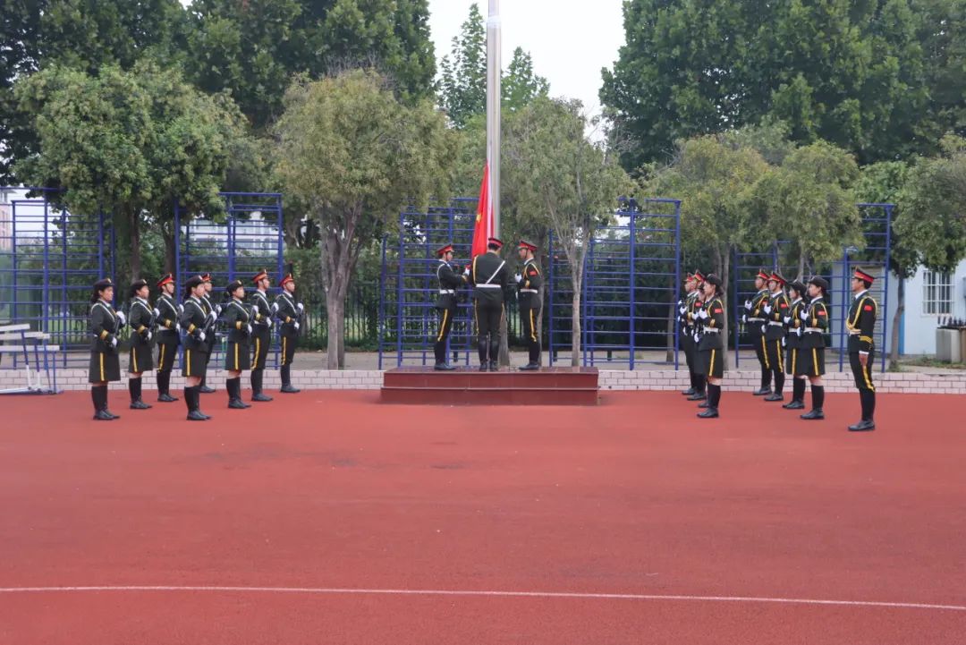 6时50分,校国旗护卫队队员动作整齐划一,昂首挺胸,护送国旗从远处走来,伴随着国歌的奏响,五星红旗冉冉升起,迎风飘扬,全体师生列队整齐,面向国旗,肃立致敬,行注目礼。